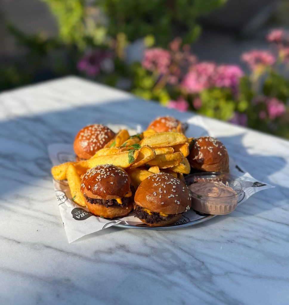 PERA BURGER İçindekiler:Cheddar, salatalık turşu, rozbif (füme et), karamelize soğan ve Pera sos Fiyat:Single (120 gr.) 480₺ Double (240 gr.) 590₺